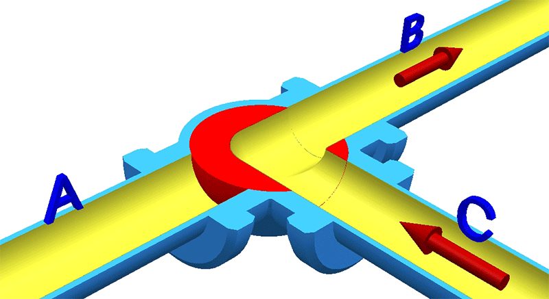 Flow paths Diverts flow between two orthogonal (perpendicular) paths. The flow can be directed from a common inlet to either of two outlets. Can mix or divert flow between three different paths. Can mix two inlets into one outlet, or divide one inlet into two outlets.