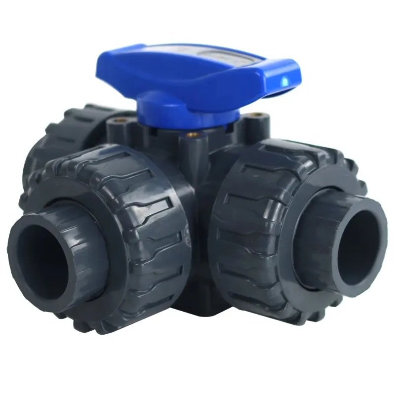 A UPVC three-way ball valve with an L-port is a fluid control device used to divert flow between two different outlets or shut off flow entirely. The valve's internal ball has an L-shaped bore that aligns with the three ports, controlling the fluid path with a simple quarter-turn (90-degree) rotation. The UPVC (unplasticized polyvinyl chloride) material makes it an ideal, cost-effective choice for corrosion-resistant applications involving water and other chemicals.