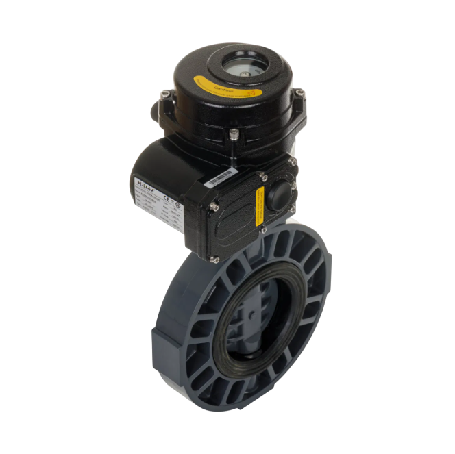 - The electric (Motorised) actuator is mounted on top of the UPVC butterfly valve's shaft, adhering to ISO 5211 standard pads.