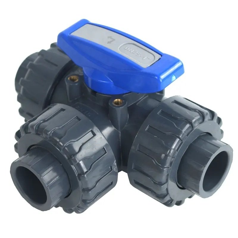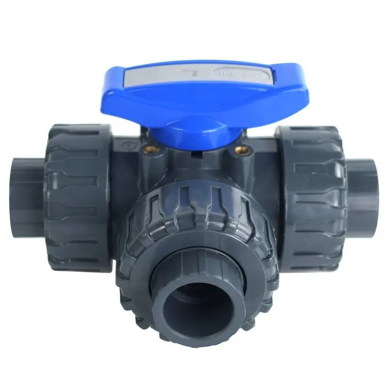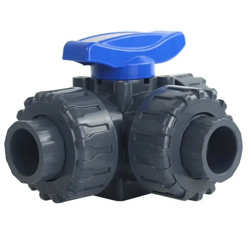 A UPVC three-way ball valve with an L-port is a fluid control device used to divert flow between two different outlets or shut off flow entirely. The valve's internal ball has an L-shaped bore that aligns with the three ports, controlling the fluid path with a simple quarter-turn (90-degree) rotation. The UPVC (unplasticized polyvinyl chloride) material makes it an ideal, cost-effective choice for corrosion-resistant applications involving water and other chemicals.