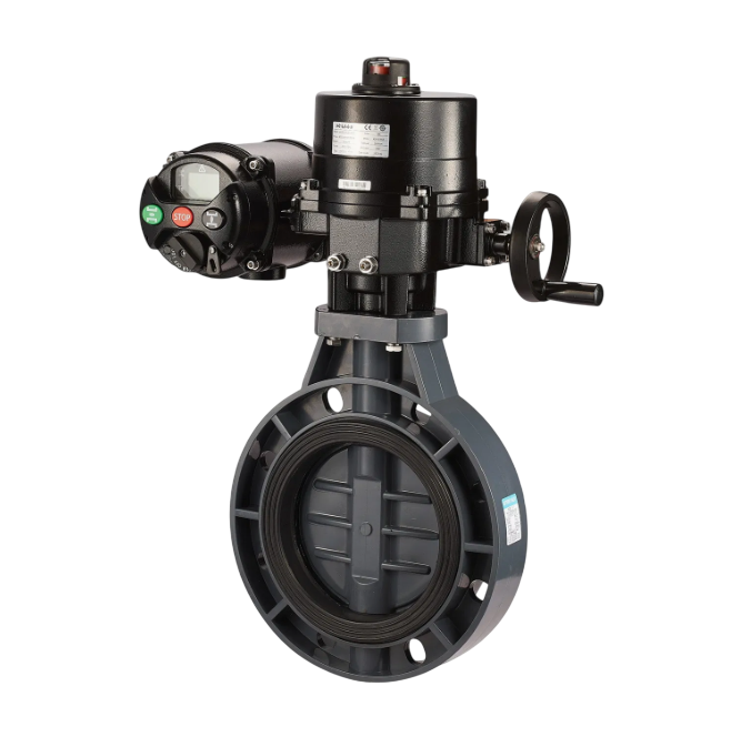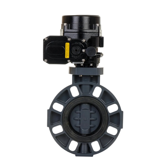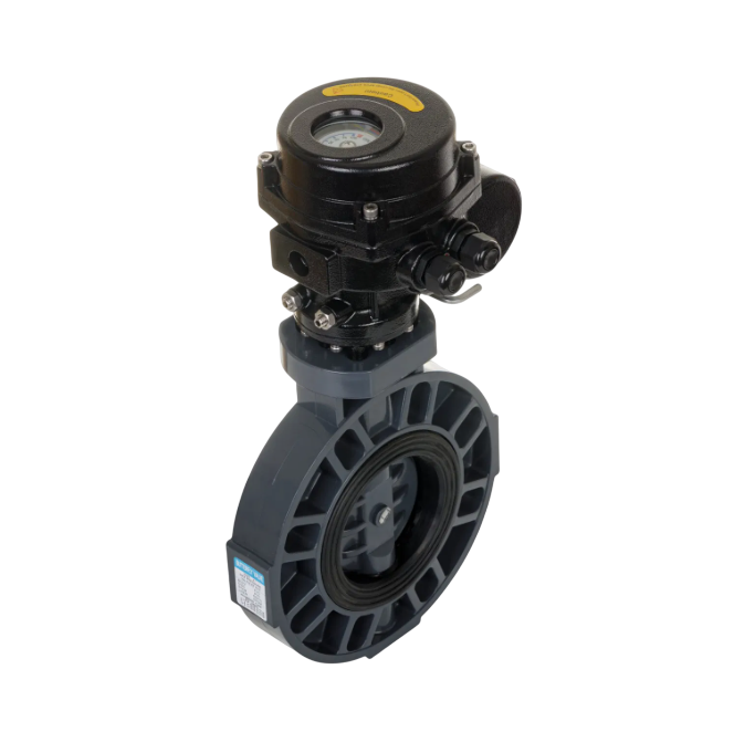 - The electric (Motorised) actuator is mounted on top of the UPVC butterfly valve's shaft, adhering to ISO 5211 standard pads.